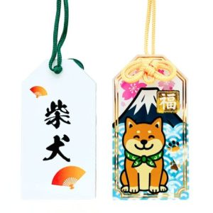 輝くレフプリズム印刷とレーザー加工で作製した柴犬のアクリルお守りです。